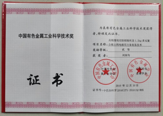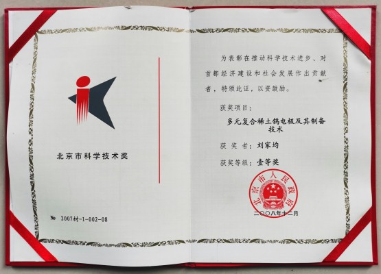 公司创始人刘家均参与的研发项目获颁北京市技术进步一等奖证书和中国有色工业科学进步二等奖 证书