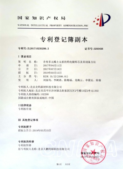 WX4钨电极2019年获得国家发明专利授权 北钨新材公司及其关联公司共获得26项钨极制造专利o