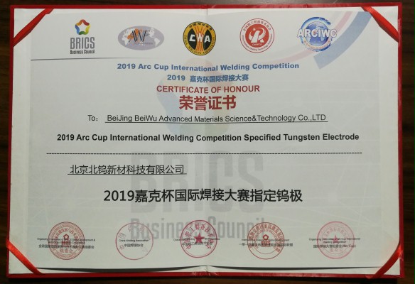 北钨新材获颁嘉克杯国际焊接大赛指定钨极证书 北钨新材获得嘉克杯国际焊接大赛竞赛支持奖