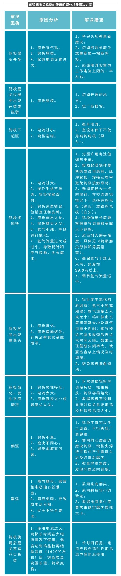 在氩弧焊过程中,经常有一些诸如电流调节、氩气保护、磨尖不当、操作不熟的等等问题最后都会表现在钨极上面,所以很多焊接从业人员认为这些问题的发生都和钨极有关,实际上大多数表现在钨极上面的问题,并不是钨极本身的问题造成的。我们将这些问题的解决方案分享出来,希望能帮助到大家。