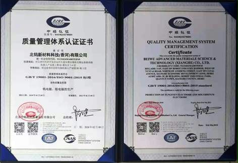 北钨新材香河工厂此次顺利通过ISO9001:2015国际质量体系认证,将为进一步提升客户服务、树立品牌形象,提供更加有力的保障。