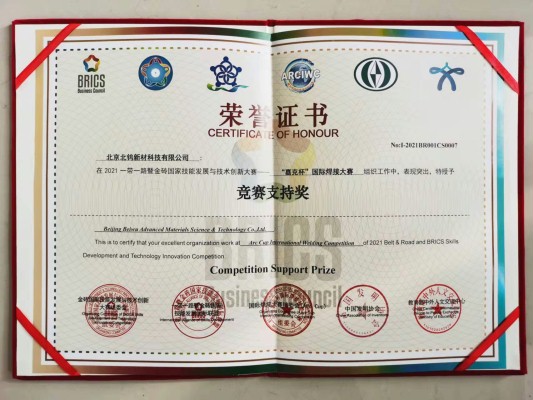 近日,我公司获得一带一路暨金砖国家技能发展国际联盟、国际焊接大赛组委会、中国发明协会、教育部中外人文交流中心联合颁发的“嘉克杯”国际焊接大赛竞赛支持奖证书,以表彰我公司在2021年嘉克杯国际焊接大赛所作出的贡献。2021年嘉克杯国际焊接大赛我公司旗下“弧立方”牌钨极产品被组委会确定为比赛用钨极并在比赛过程中质量稳定可靠,受到各国参赛选手和教练领队的好评!