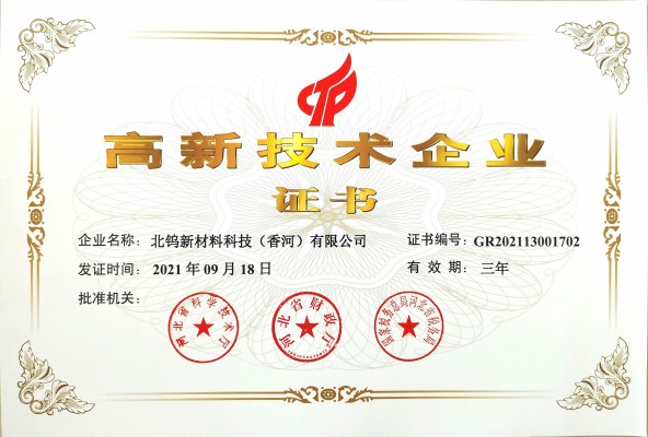 近日,北钨新材公司再传佳讯,北钨新材料科技(香河)有限公司被正式认定为“国家级高新技术企业”,获颁高新企业证书。该资质的取得是科技主管部门对北钨新材公司在产品和技术研发创新工作的肯定,同时也是对公司在未来继续在研发创新方面加大投入提供了实际支持和鼓励。