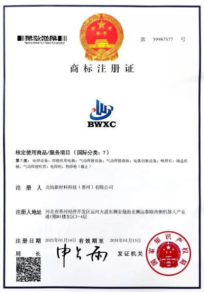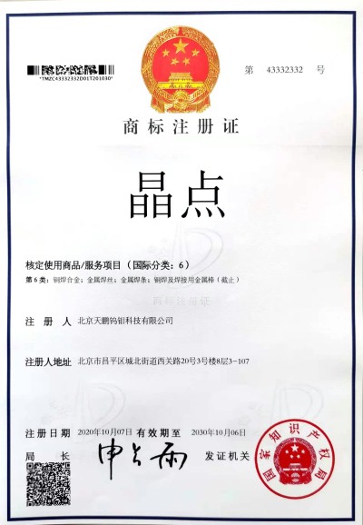 注册商标 北钨新材公司旗下产品商标均已获得国家知识产权商标注册证书或商标使用授权,并且根据企业发展需要进行必要的商标储备注册和侵权防御注册,以下为商标注册部分证书: 北钨新材注册证书 BWXC注册证书 晶点注册证书1 晶点注册证书2 弧立方证书1 弧立方证书2