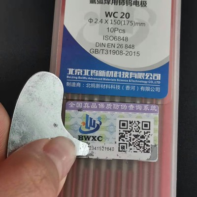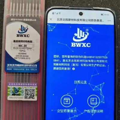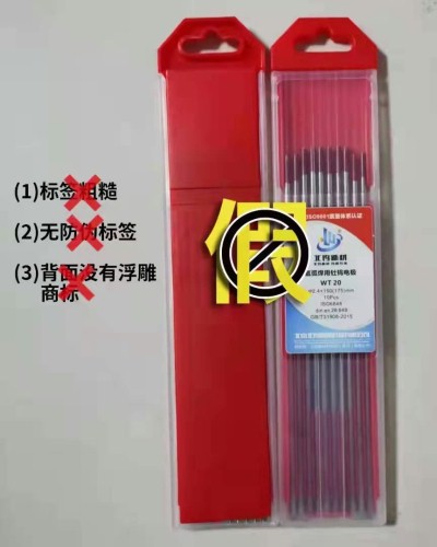 为了让广大客户能够购买到北京北钨新材公司的正品钨极,北京北钨新材公司设置了多重防伪并大力宣传,希望广大客户能够了解,不给假冒伪劣产品可乘之机。随着北京北钨新材公司钨电极产品的畅销,一些人在利益驱使下开始伪造北京北钨新材公司的包装用品,向客户推销假冒北钨新材公司的钨极,严重侵犯了我公司的权益,也严重侵犯了消费者的权益。对此我公司会坚决对假冒伪劣产品进行打击,欢迎广大客户向我们提供线索。